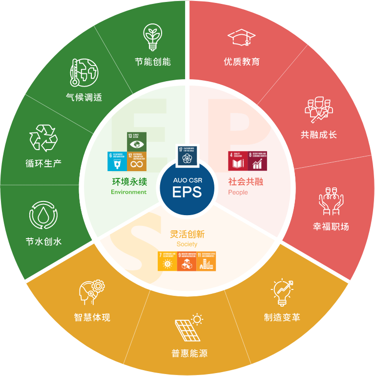 根据联合国所发展的17项永续发展目标,z6尊龙(中国有限公司)-官方网站光电以「超越企业社会责任,创造共享价值」为企业永续愿景发展蓝图,订出环境永续、共融成长与灵活创新的EPS(Environment, People & Society)三大永续发展主轴;以响应日益受关切的环境议题与社会共融趋势。