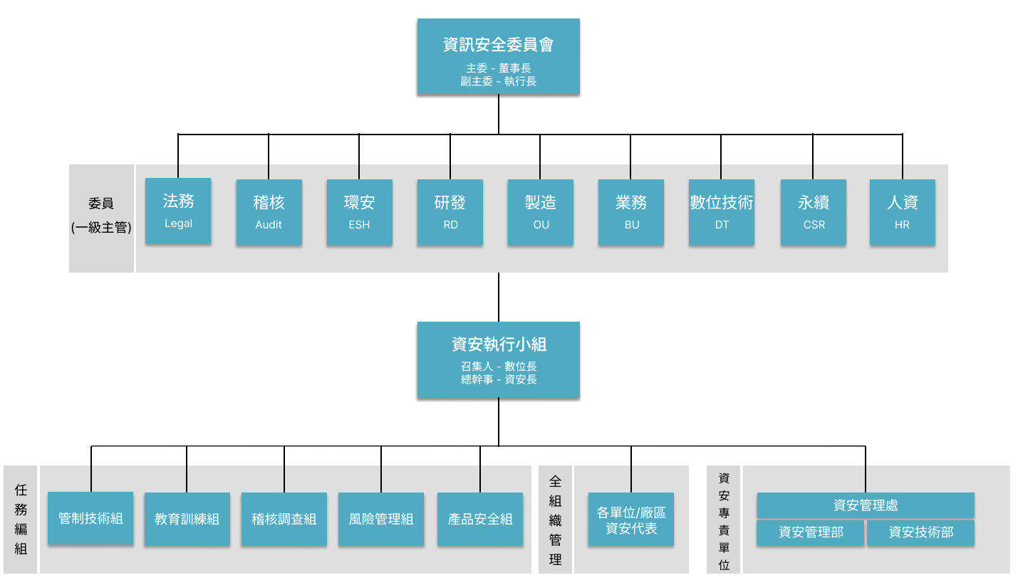• 全球營運持續應變指揮體系由董事長暨執行長率領一級主管包含業務、製造、供應鏈、人資、資訊、財務等坐鎮指揮,並成立相關工作小組執行相關應變決策