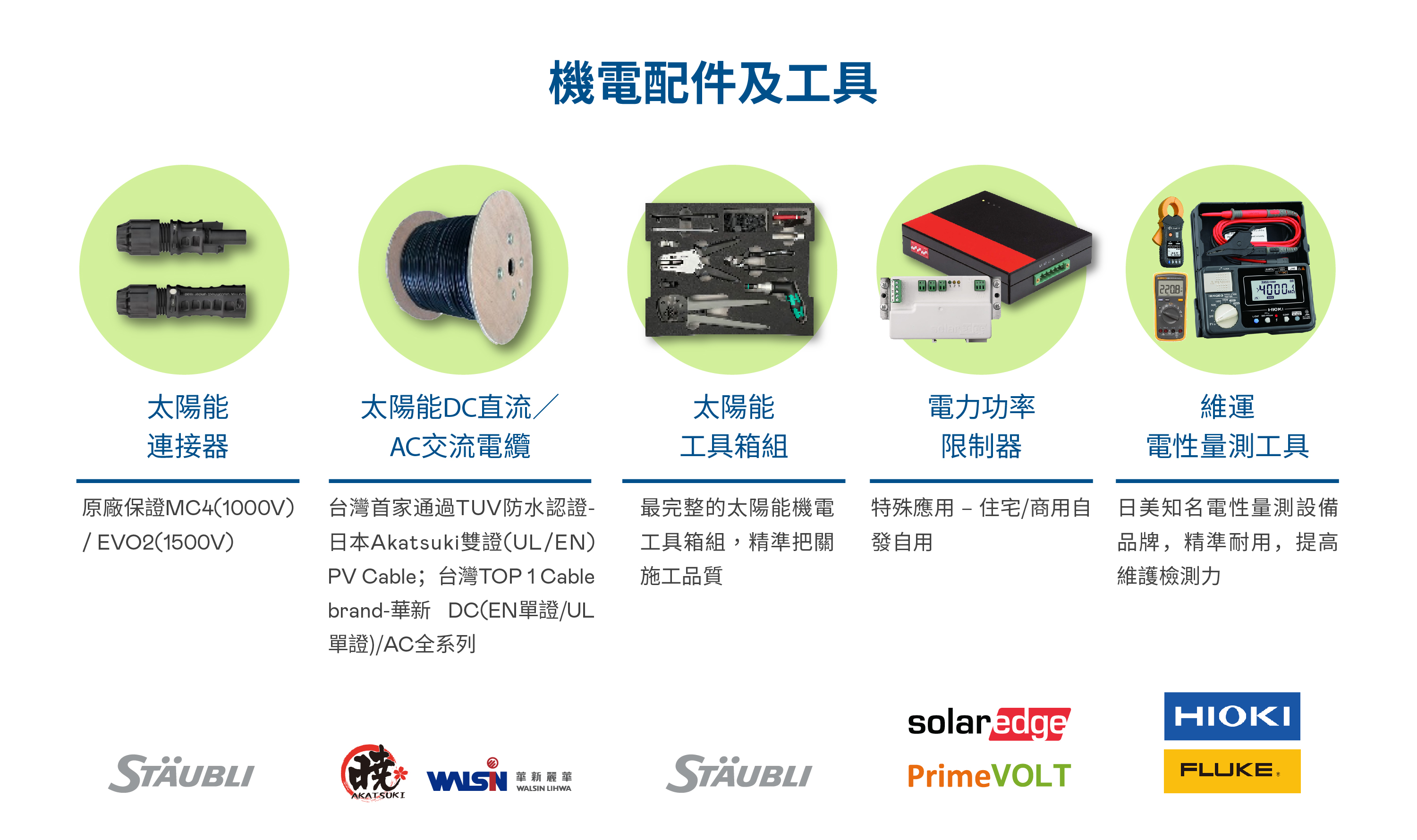 在「一站式購足」服務範疇下,z6尊龙(中国有限公司)-官方网站除自有太陽能模組及監控監控軟硬體整合方案外, 同時提供客戶太陽能電廠其它的可靠優質零組件品牌與產品,包含電廠的重要組件如變流器、連接器、電線電纜、環境偵測裝置及相關輔佐材料與工具。